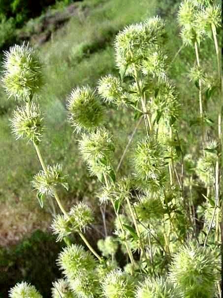 Matilla de ramas cuadradas, cubierta de pequeños pelillos que le dan aspecto blanquecino. Pequeñas hojas aovadas. De la mitad para arriba los vástagos forman, en su tiempo, largos ramilletes de flores que aparecen como bolitas blancas en la cima de los tallos. Florece en mayo por Andalucía.